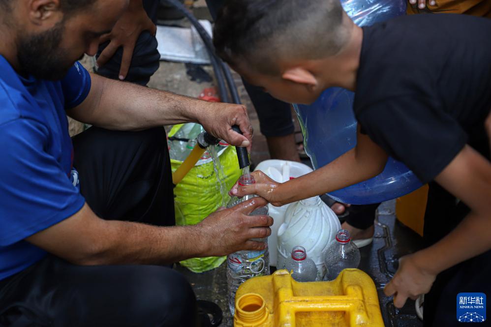 10月26日,人們在加沙地帶南部城市汗尤尼斯街頭打水。