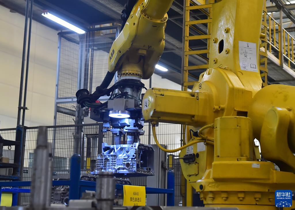10月25日,在現代坦迪斯自動(dòng)變速箱(山東)有限公司生產(chǎn)車(chē)間,工業(yè)機器人在變速箱生產(chǎn)線(xiàn)上作業(yè)。