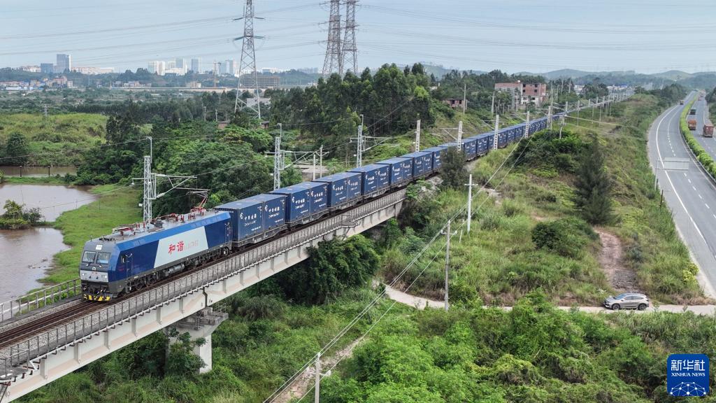 滿(mǎn)載集裝箱的貨列穿行在西部陸海新通道上(10月9日攝,無(wú)人機照片)。