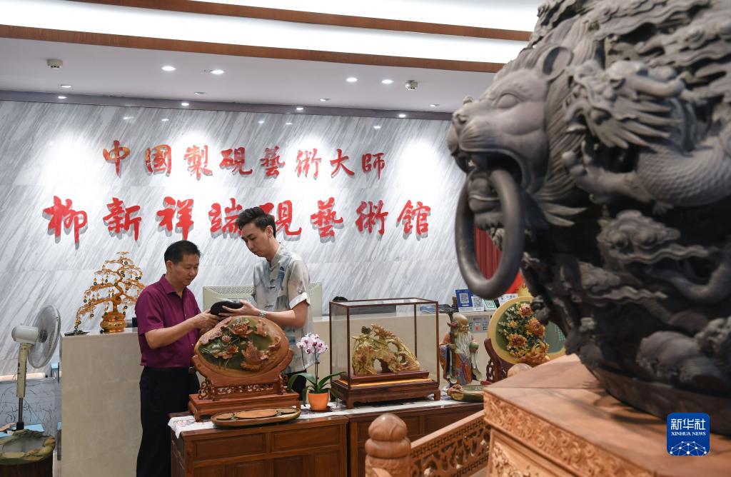 10月26日,在廣東肇慶柳新祥端硯藝術(shù)館,柳新祥(左)和兒子柳飛在討論端硯作品。