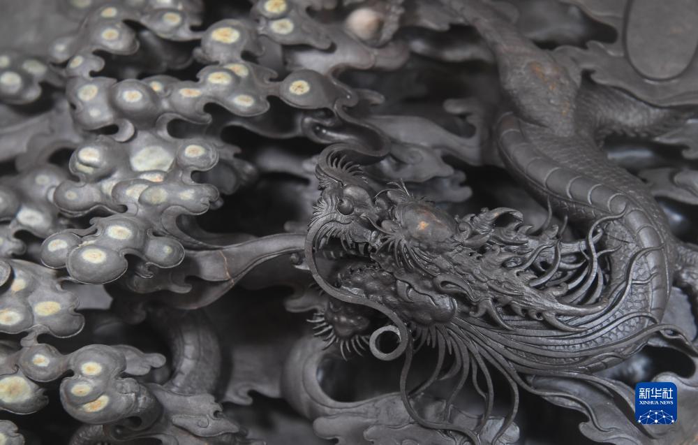 這是柳新祥端硯作品雕刻的飛龍形象及端硯獨特的石眼(10月25日攝)。