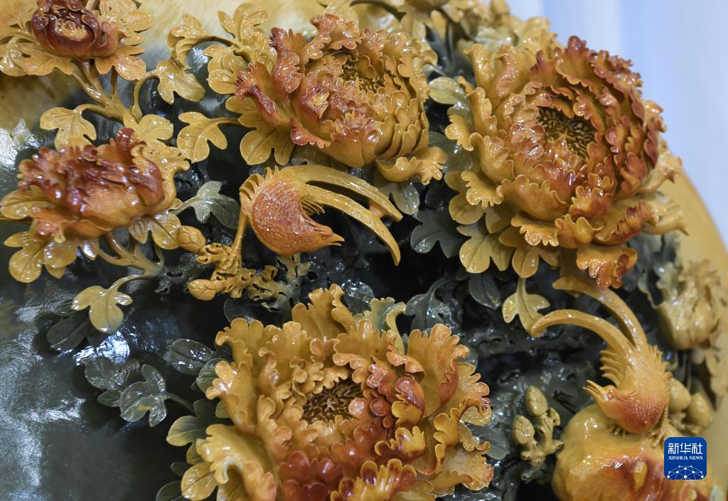 這是10月25日拍攝的柳新祥端硯作品綠端“國色天香硯”的局部。