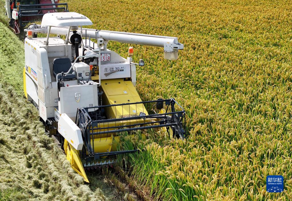 10月27日,無(wú)人駕駛機械在江蘇省南通市通州區十總鎮育民村高標準農田收割水稻(無(wú)人機照片)。
