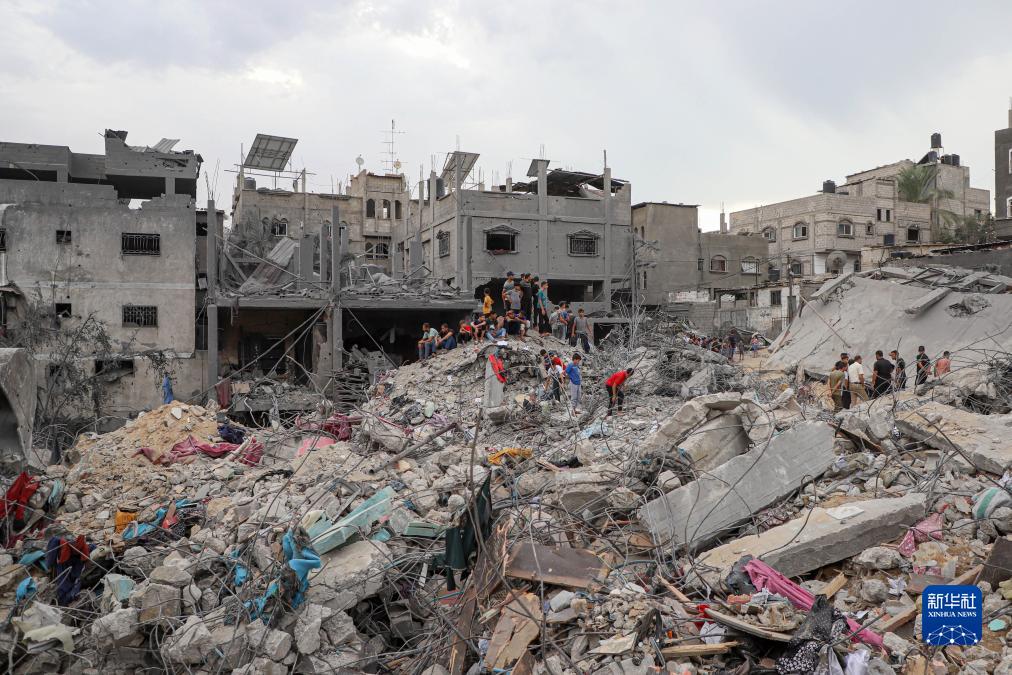 10月27日,在加沙地帶南部城市汗尤尼斯,人們查看建筑廢墟。