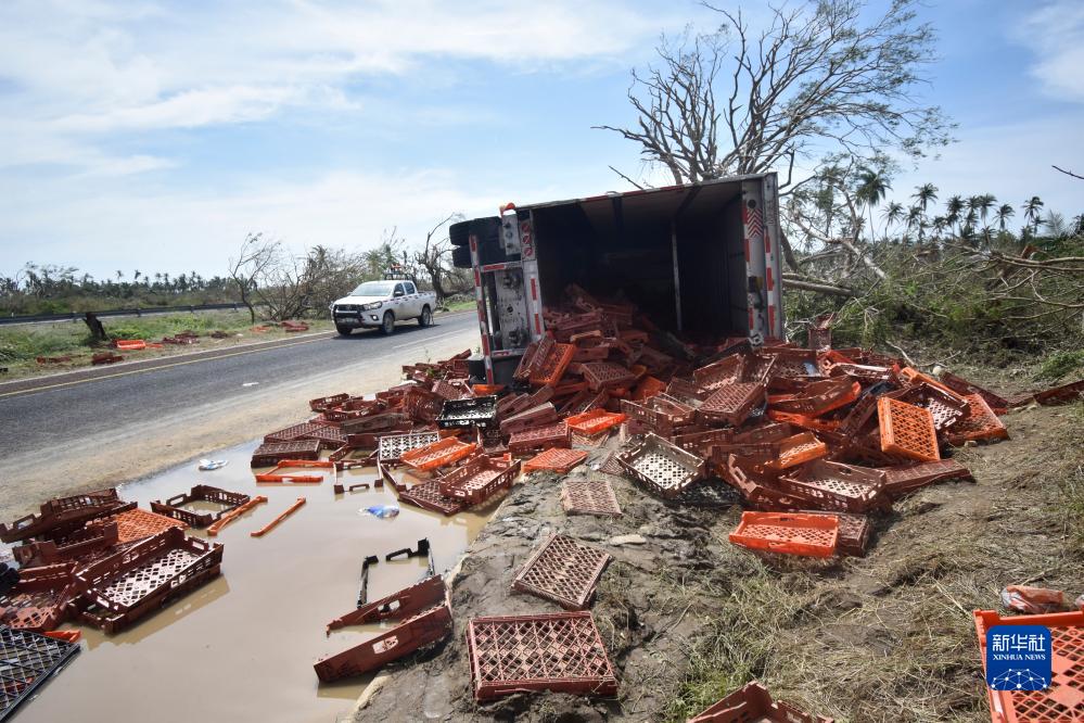 這是10月26日在墨西哥格雷羅州阿卡普爾科拍攝的翻倒在路旁的卡車(chē)。