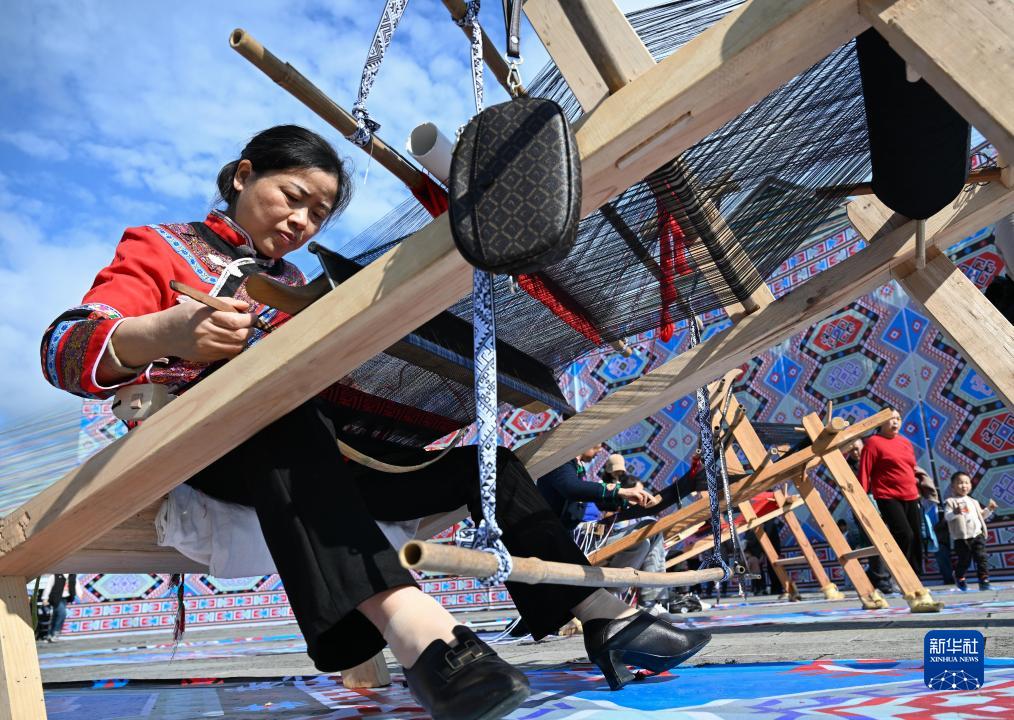 當日,數十名織錦女工在湖北省來(lái)鳳縣龍鳳文化中心廣場(chǎng)現場(chǎng)進(jìn)行“西蘭卡普”制作,普及非遺文化。