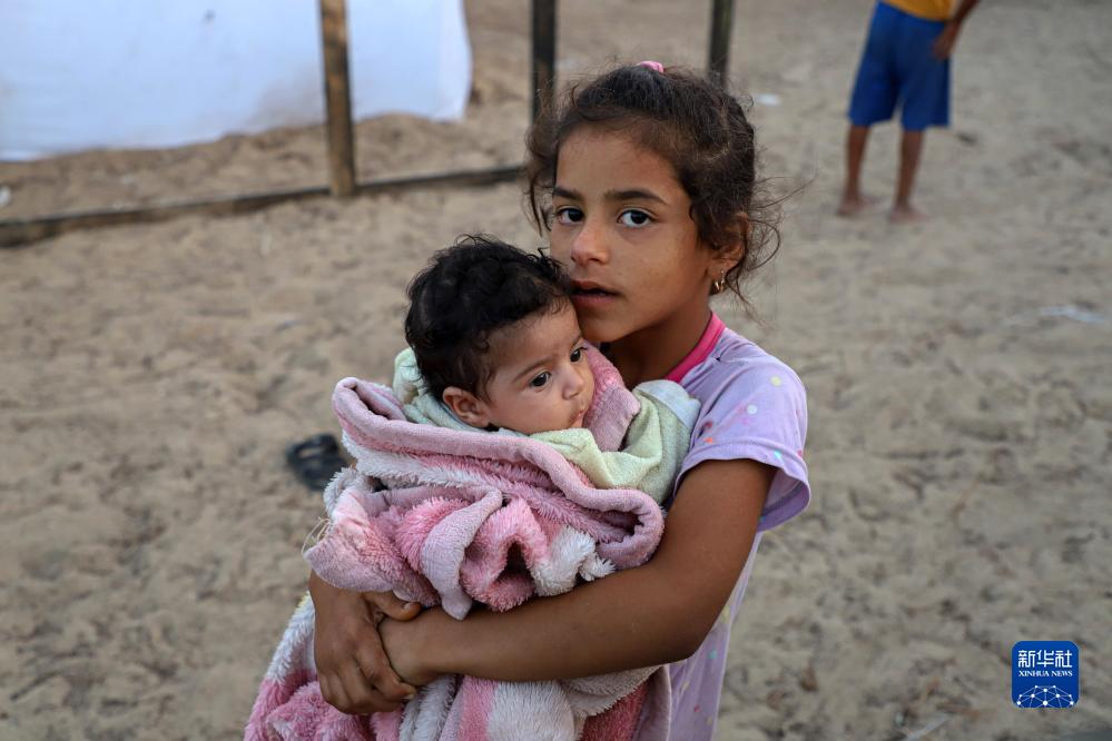 這是10月25日在加沙地帶南部一處臨時(shí)營(yíng)地內拍攝的巴勒斯坦兒童。