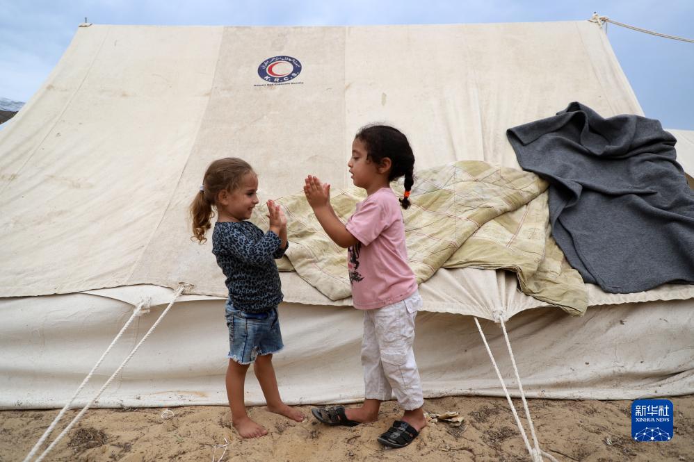 這是10月27日在加沙地帶南部城市汗尤尼斯一處臨時(shí)營(yíng)地內拍攝的巴勒斯坦兒童。