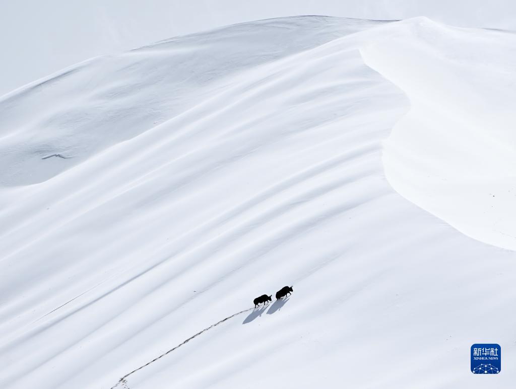 10月16日,在阿爾金山國家級自然保護區,野牦牛攀爬雪后的庫木庫里沙漠。