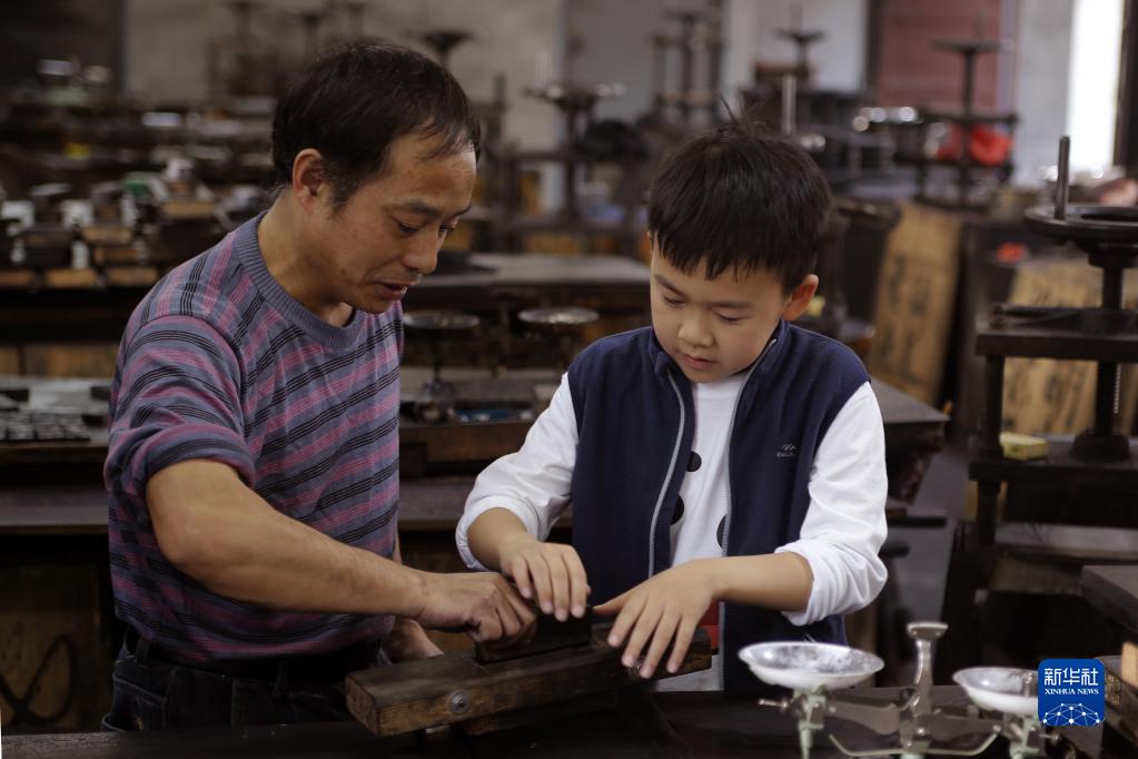 10月24日,周健的兒子周墨(右)在工人的指導下制作徽墨。