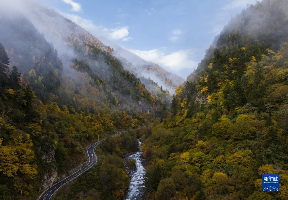 前往黨嶺村的鄉村旅游公路蜿蜒在高山峽谷中(10月27日攝,無(wú)人機照片)。