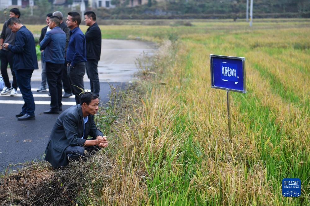 10月28日,在婁底市雙峰縣石牛鄉上茶村,種糧大戶(hù)們觀(guān)摩不同品種的再生稻。