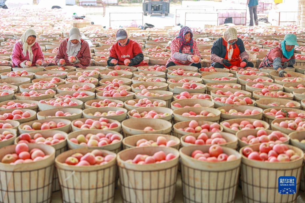 連日來(lái),山東省榮成市各大蘋(píng)果園里一派繁忙景象,果農們抓緊時(shí)間收獲蘋(píng)果,分揀、裝運發(fā)往各地市場(chǎng)。