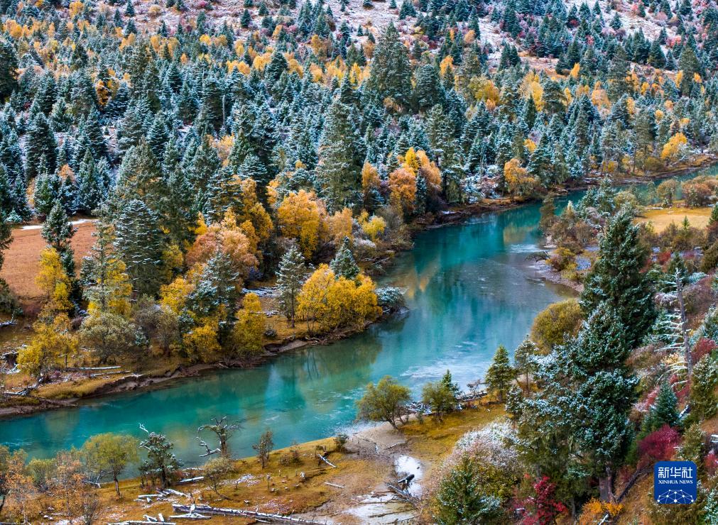 時(shí)值金秋,西藏林芝市秋色已濃,黃葉與初雪交織,流水并雪山輝映,景色如詩(shī)如畫(huà)。