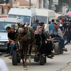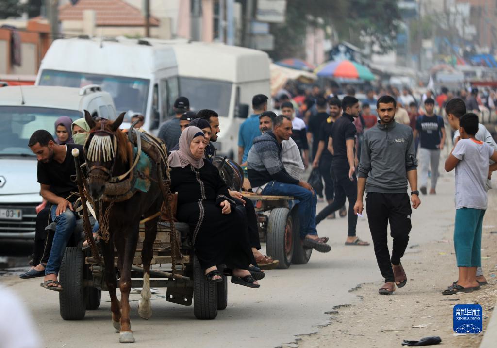 10月29日,因缺乏燃料,人們在加沙地帶南部城市汗尤尼斯使用驢車(chē)出行。