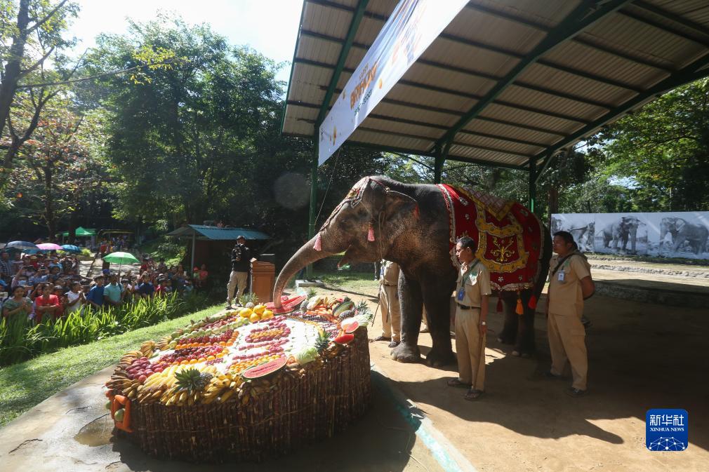 當日,雌性大象莫莫在緬甸仰光動(dòng)物園品嘗由水果和蔬菜制成的蛋糕,慶祝70歲生日。新華社發(fā)(苗覺(jué)梭攝)