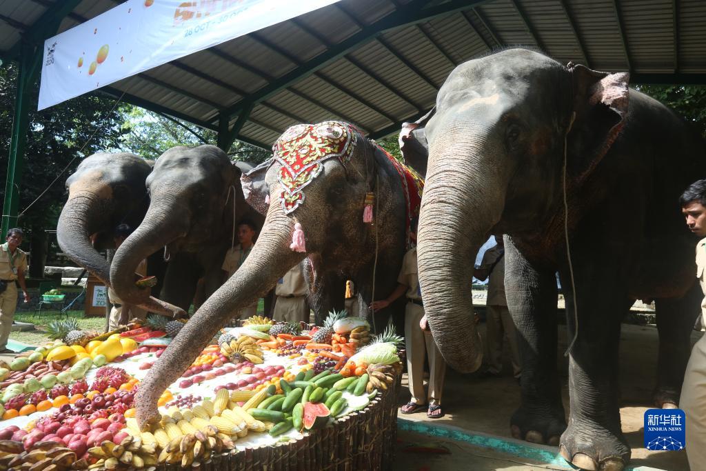 10月29日,雌性大象莫莫和同伴在緬甸仰光動(dòng)物園享用由水果和蔬菜制成的蛋糕。