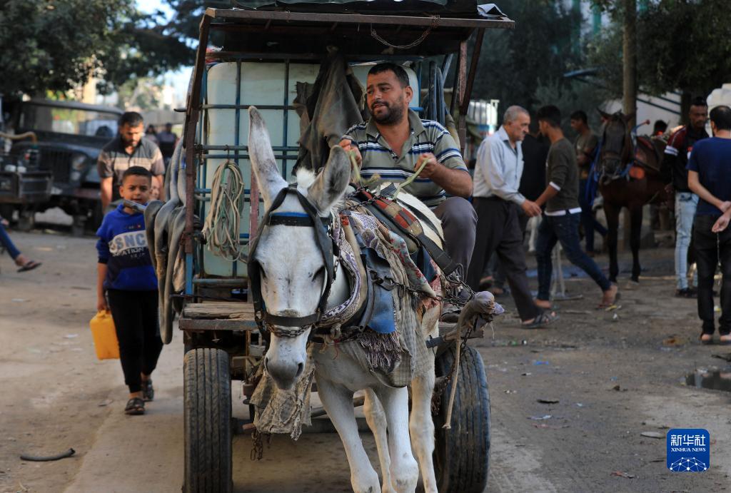 10月30日,因缺乏燃料,人們在加沙地帶南部城市汗尤尼斯使用畜力車(chē)運輸飲用水。