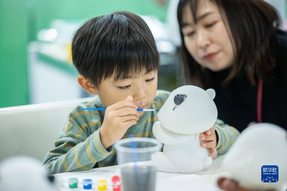 10月28日,一名兒童在日本大阪國際會(huì )展中心中國館體驗為熊貓玩偶上色。