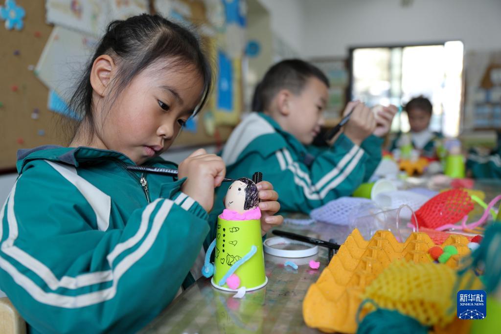 10月31日,貴州省開(kāi)陽(yáng)縣第二幼兒園的孩子用廢棄雞蛋殼和紙杯制作手工藝品。