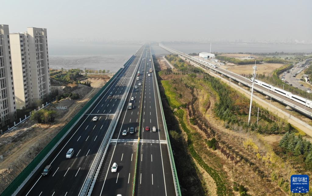 車(chē)輛行駛在青蘭高速全線(xiàn)起點(diǎn)雙埠收費站附近(10月31日攝,無(wú)人機照片)。