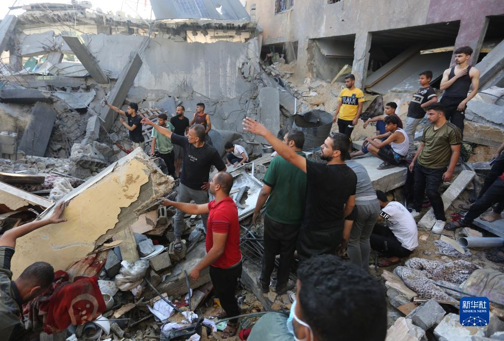 10月31日,在加沙地帶南部城市拉法,人們在廢墟中搜尋幸存者。