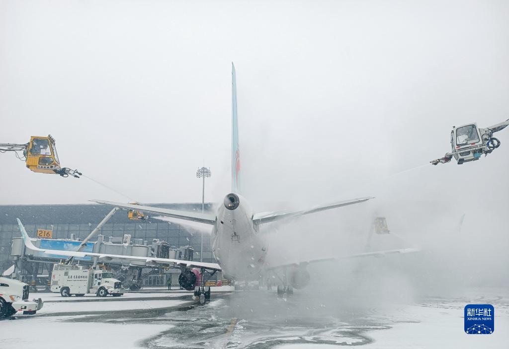 11月1日,長(cháng)春龍嘉機場(chǎng)工作人員對飛機進(jìn)行除冰除雪作業(yè)。