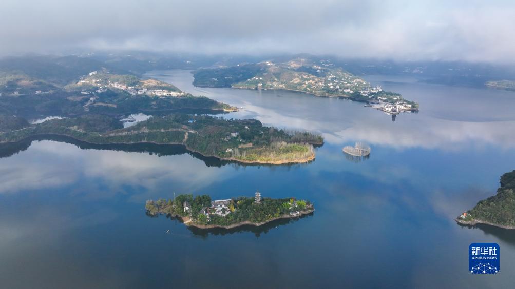 11月1日拍攝的陜西安康瀛湖景區秋景(無(wú)人機照片)。