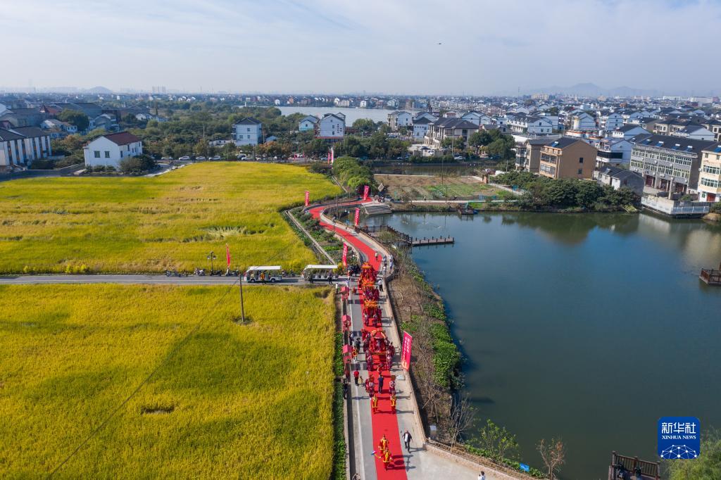 坐上大花轎、走過(guò)合歡橋、跨過(guò)紅火缸、同乘幸福船……11月3日,一場(chǎng)“良緣水鄉締 佳偶自天成”水鄉集體婚禮在浙江省杭州市臨平區塘棲鎮丁河村新建成的“丁山湖魚(yú)鷹愛(ài)情故事婚禮基地”舉行。八對新人在村民和游客的見(jiàn)證下喜結良緣,并發(fā)出《婚俗改革倡議書(shū)》,向廣大適婚青年傳播新時(shí)代的婚戀觀(guān),倡導健康文明的嫁娶新風(fēng)尚。該婚禮基地依托水鄉風(fēng)貌,已成為當地特色鄉村文旅品牌。