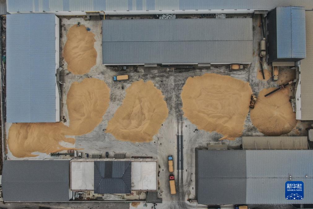 11月2日,農戶(hù)將收獲的稻谷送往盤(pán)錦市大洼區一家糧食加工企業(yè)(無(wú)人機照片)。