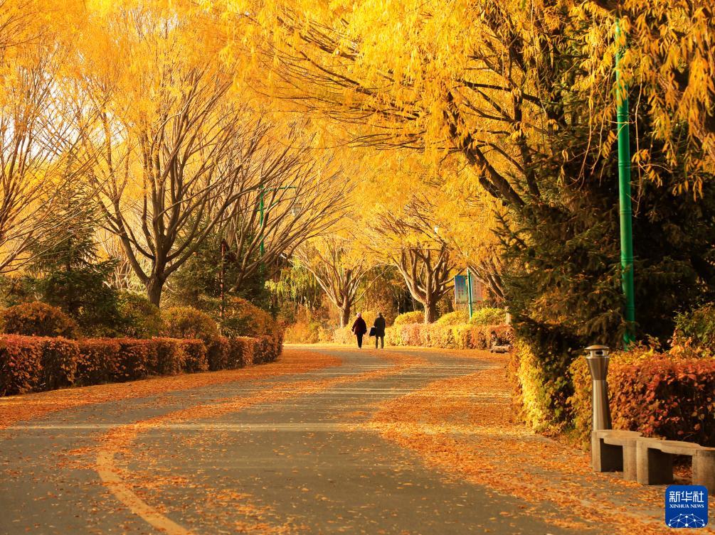 11月2日,市民行走在甘肅張掖國家濕地公園南口景觀(guān)大道上。