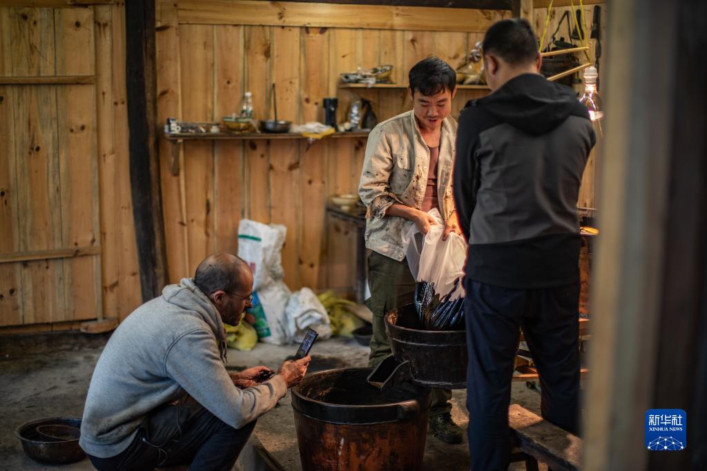 9月21日,在重慶市城口縣北屏鄉松柏村,文森(左)在工作室拍攝記錄黑漆過(guò)濾過(guò)程。