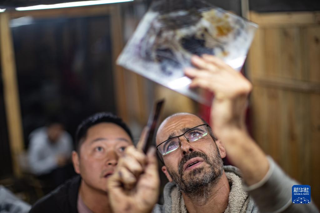 9月20日,在重慶市城口縣北屏鄉松柏村,文森(右)在工作室內指導村支書(shū)鄒昌舉分辨黑漆制作中的狀態(tài)。