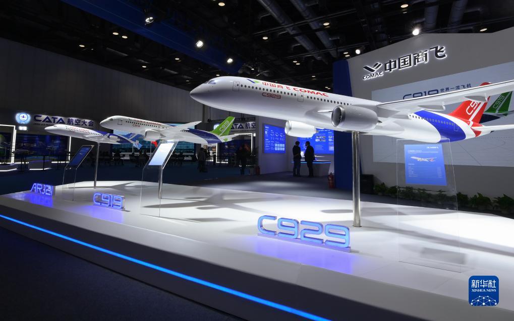 11月3日在中國商用飛機有限責任公司展臺拍攝的國產(chǎn)C929(右)、C919(中)等飛機模型。