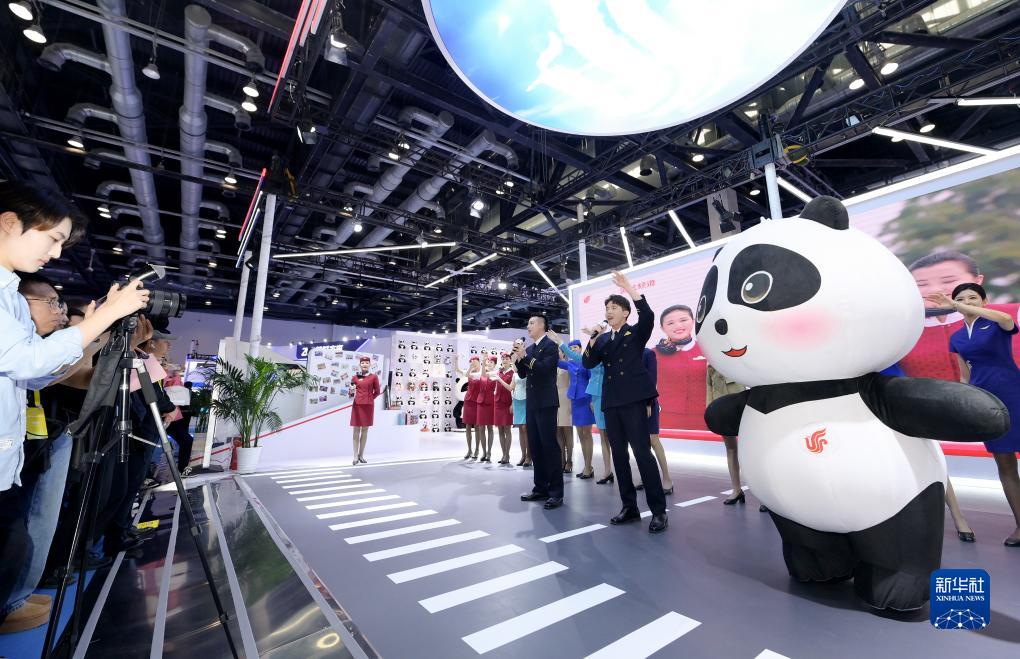 11月3日,來(lái)自中國國際航空公司的空乘人員在展臺進(jìn)行制服秀表演。