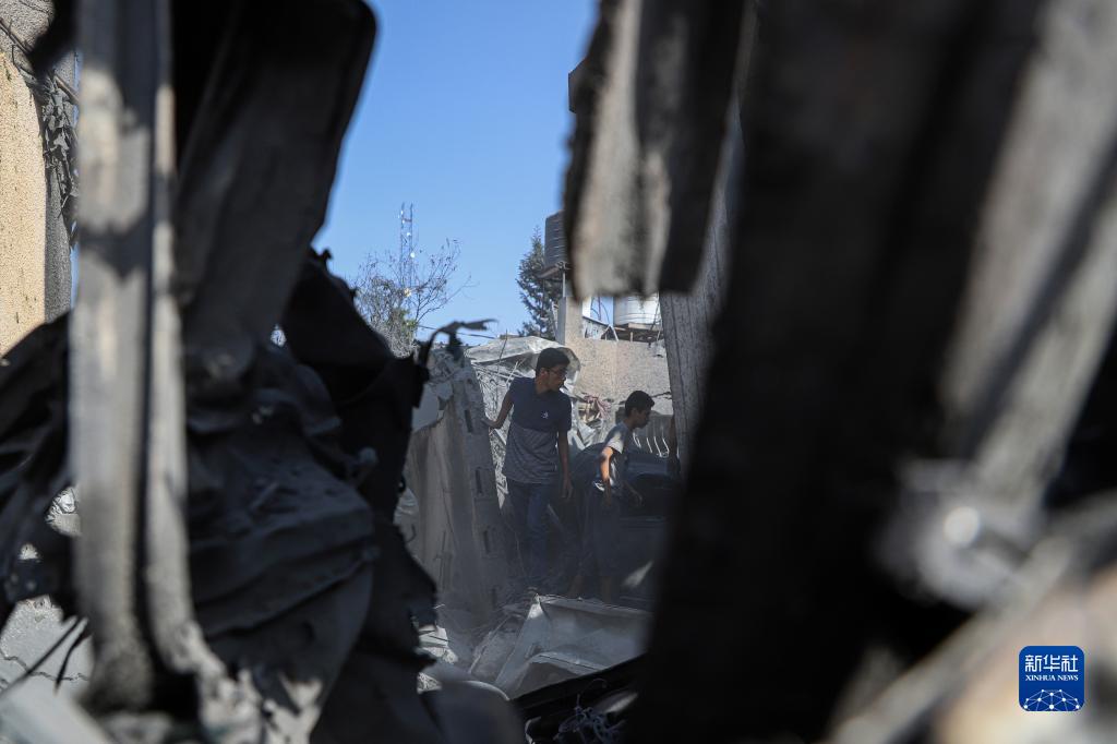 11月3日,在加沙地帶南部城市汗尤尼斯,人們在遭襲擊后的建筑廢墟上實(shí)施救援。