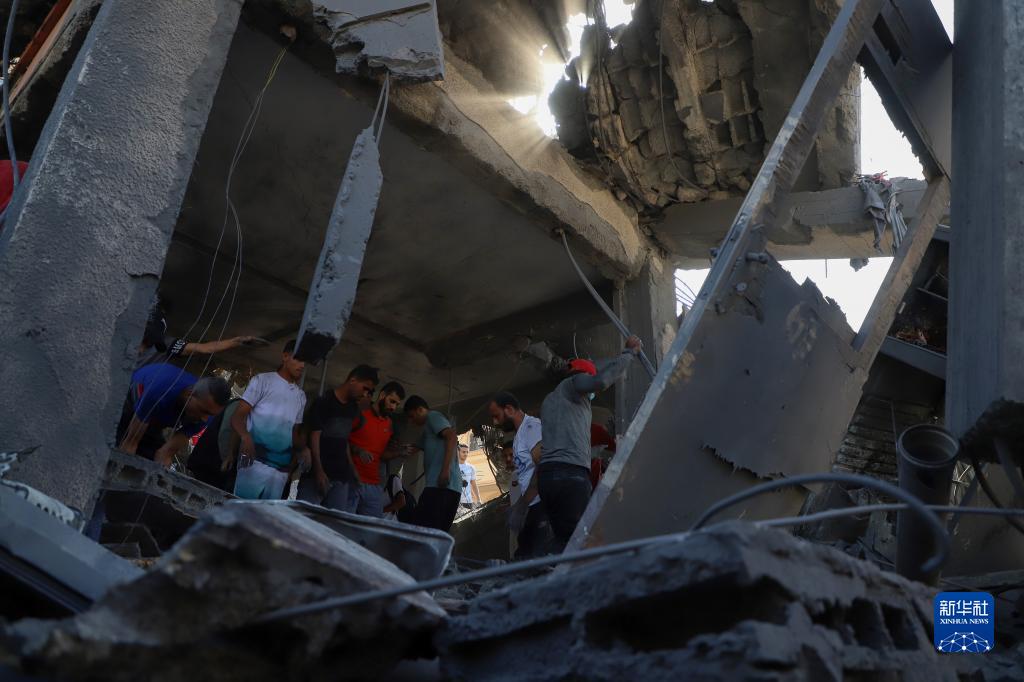11月3日,在加沙地帶南部城市汗尤尼斯,人們在遭襲擊后的建筑廢墟上實(shí)施救援。