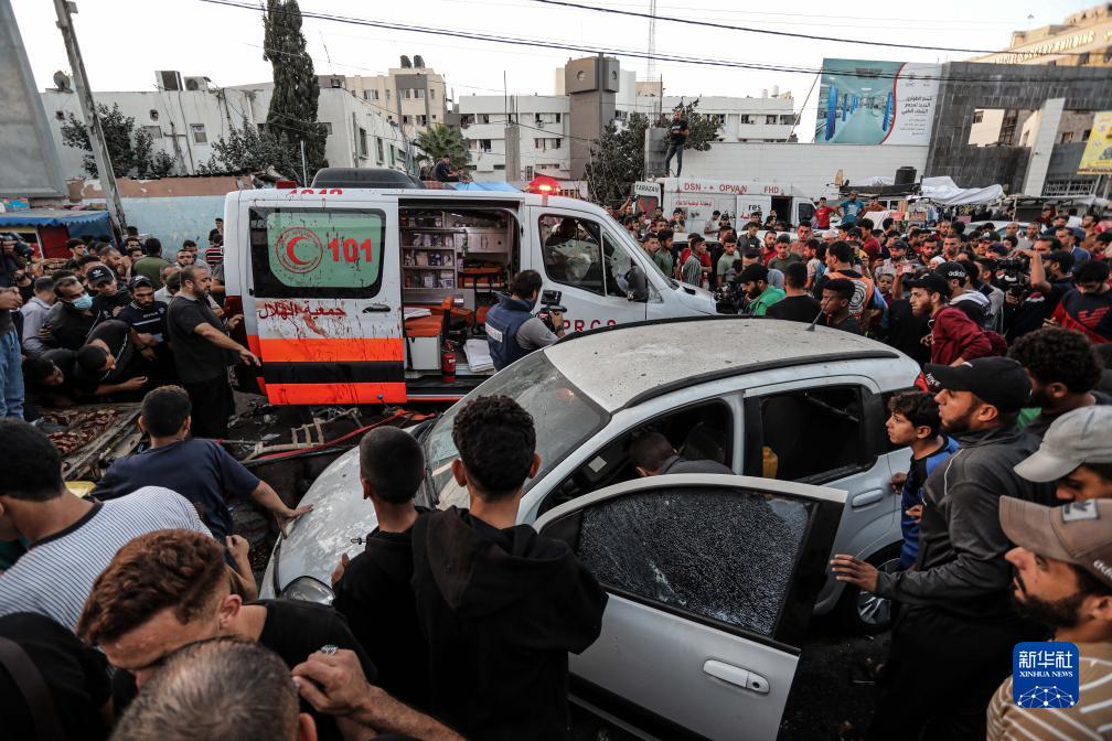 11月3日,在加沙城希法醫院門(mén)口,人們查看被襲擊的車(chē)輛。