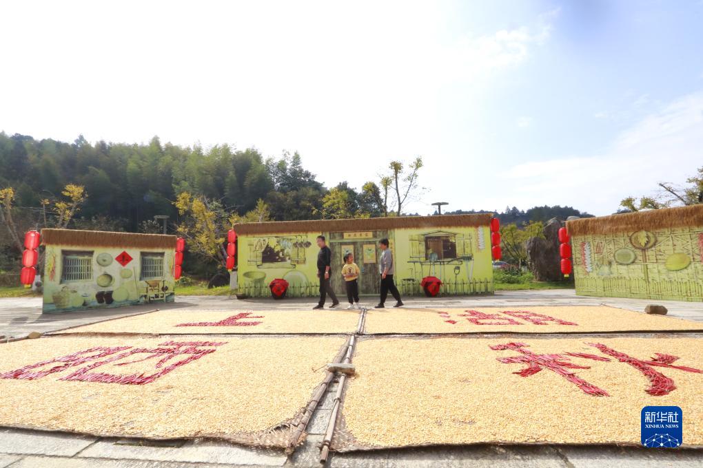 秋收時(shí)節,農民利用晴好天氣在房前屋后晾曬農作物,一派豐收景象。