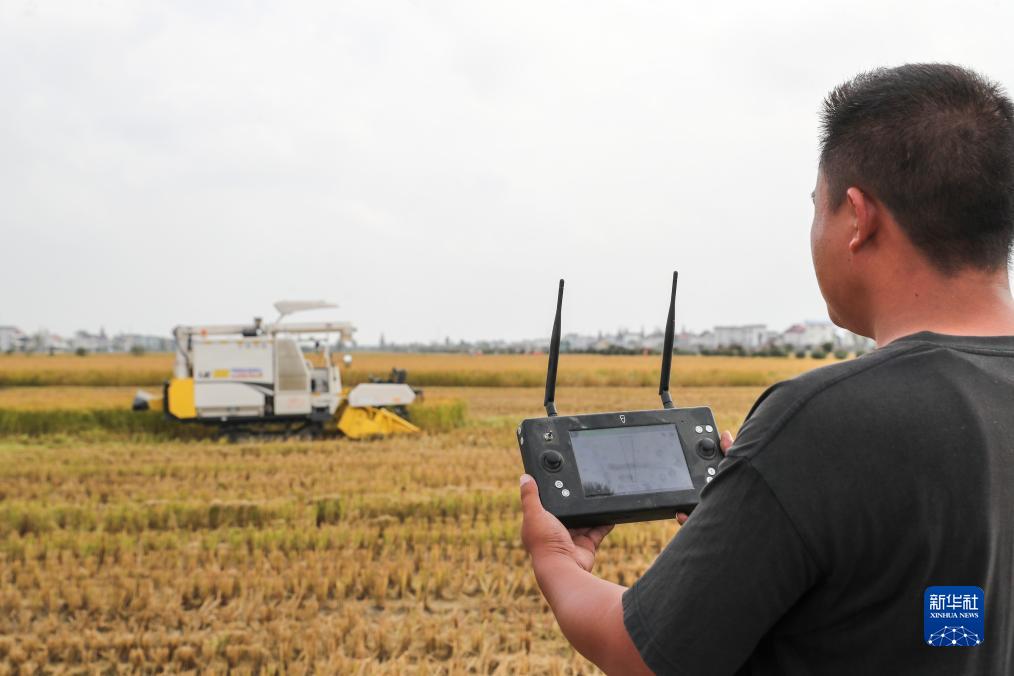 11月4日,在南通市通州區十總鎮育民村農場(chǎng),技術(shù)員查看一臺設置好參數的無(wú)人收割機工作情況。