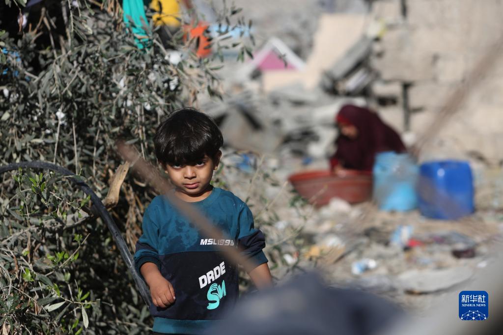 這是11月4日在加沙地帶南部城市拉法遭以色列襲擊損毀的建筑廢墟處拍攝的婦女兒童。