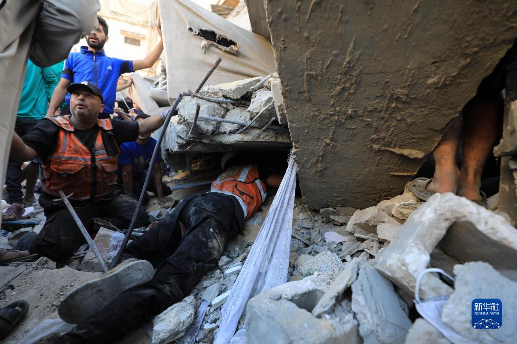 11月4日,在加沙地帶南部城市汗尤尼斯,人們在遭以色列襲擊后的建筑廢墟中實(shí)施救援。