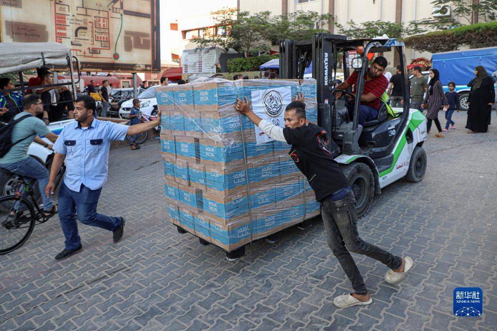 11月4日,在加沙南部城市汗尤尼斯,工人搬運救援物資。