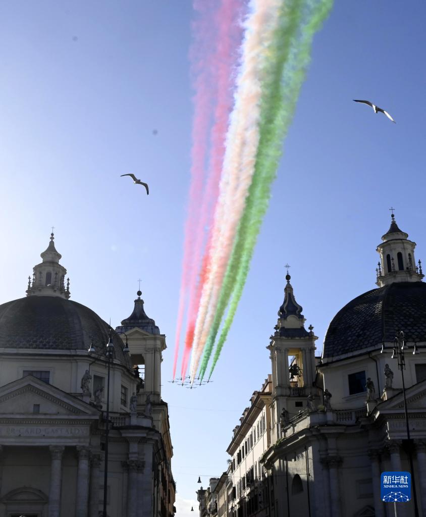 11月4日,意大利“三色箭”飛行表演隊噴出象征國旗三色的煙霧飛過(guò)羅馬上空,慶祝國家團結日。