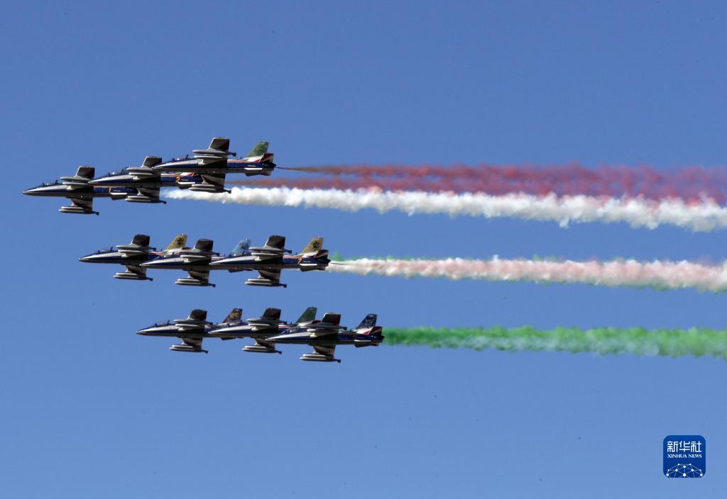 11月4日,意大利“三色箭”飛行表演隊噴出象征國旗三色的煙霧飛過(guò)羅馬上空,慶祝國家團結日。