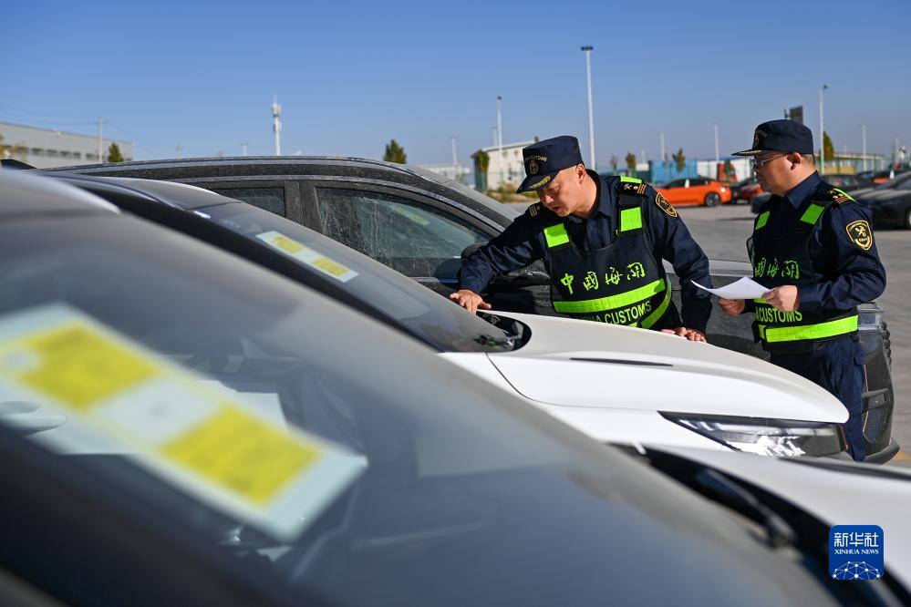 海關(guān)關(guān)員在新疆喀什綜合保稅區內的海關(guān)施封集中查驗作業(yè)區查驗出口商品車(chē)(11月4日攝)。