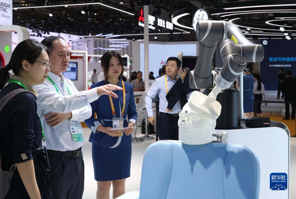 11月5日,參觀(guān)者在第六屆進(jìn)博會(huì )歐姆龍公司展出的黑海豚靶向磁刺激機器人展品旁交流。