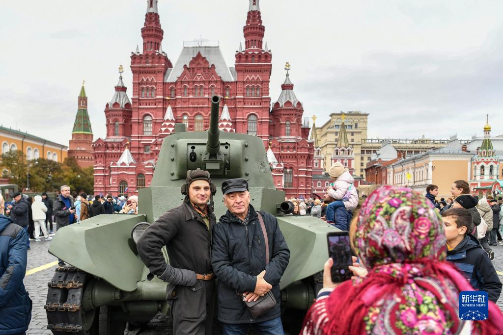 11月5日,在俄羅斯首都莫斯科,人們在以紀念1941年蘇聯(lián)紅場(chǎng)閱兵式為主題的露天展覽上拍照。