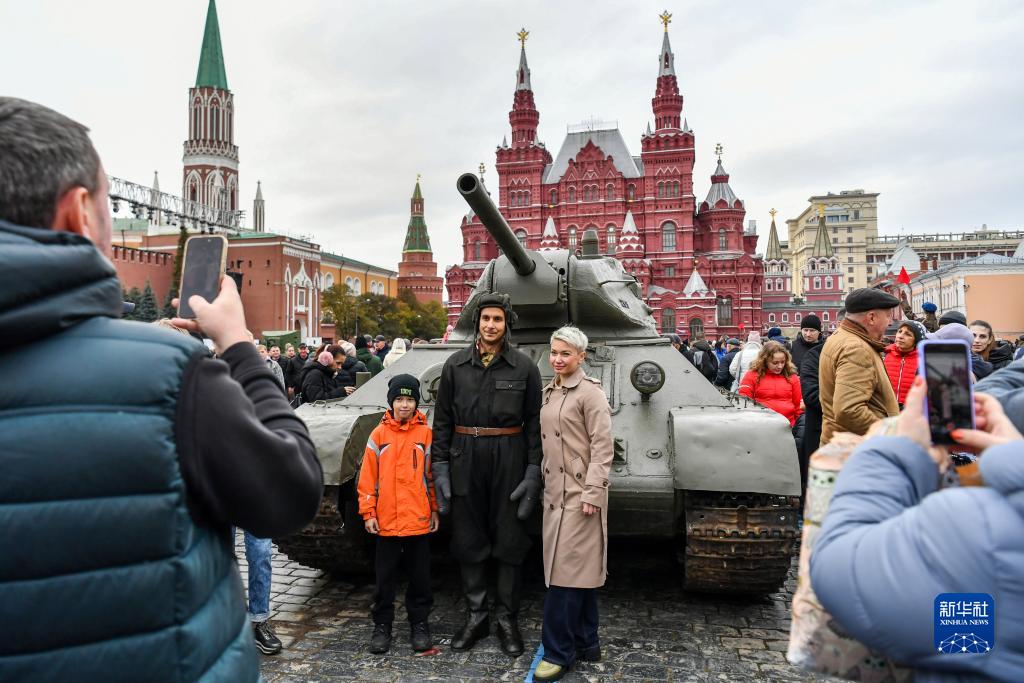 11月5日,在俄羅斯首都莫斯科,人們在以紀念1941年蘇聯(lián)紅場(chǎng)閱兵式為主題的露天展覽上拍照。