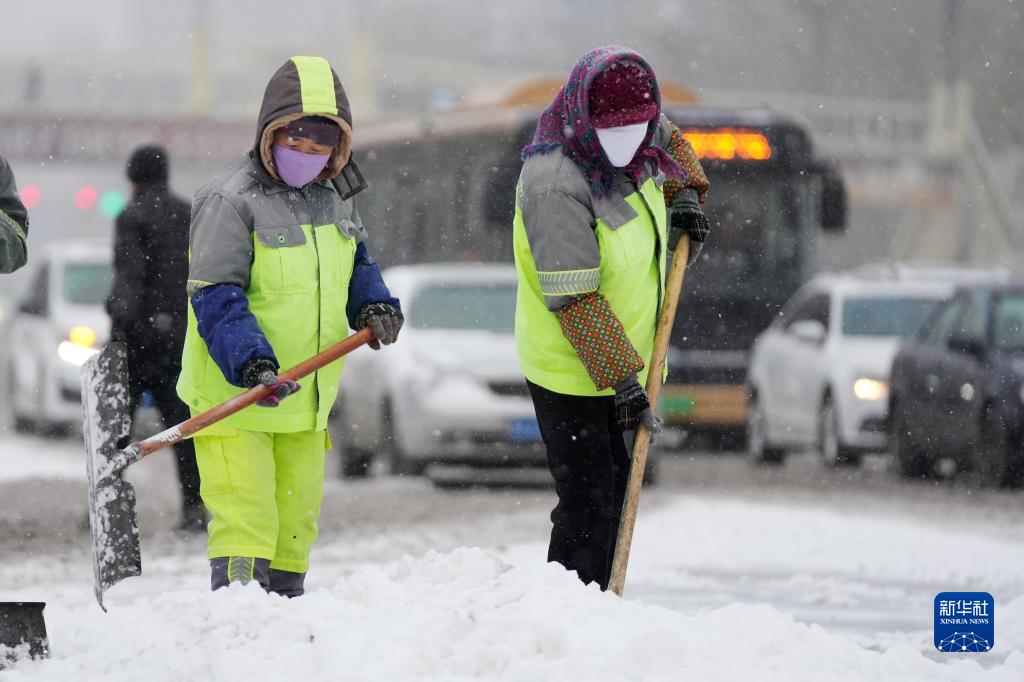 11月6日,在哈爾濱市主干道中山路上,環(huán)衛工人在清雪。